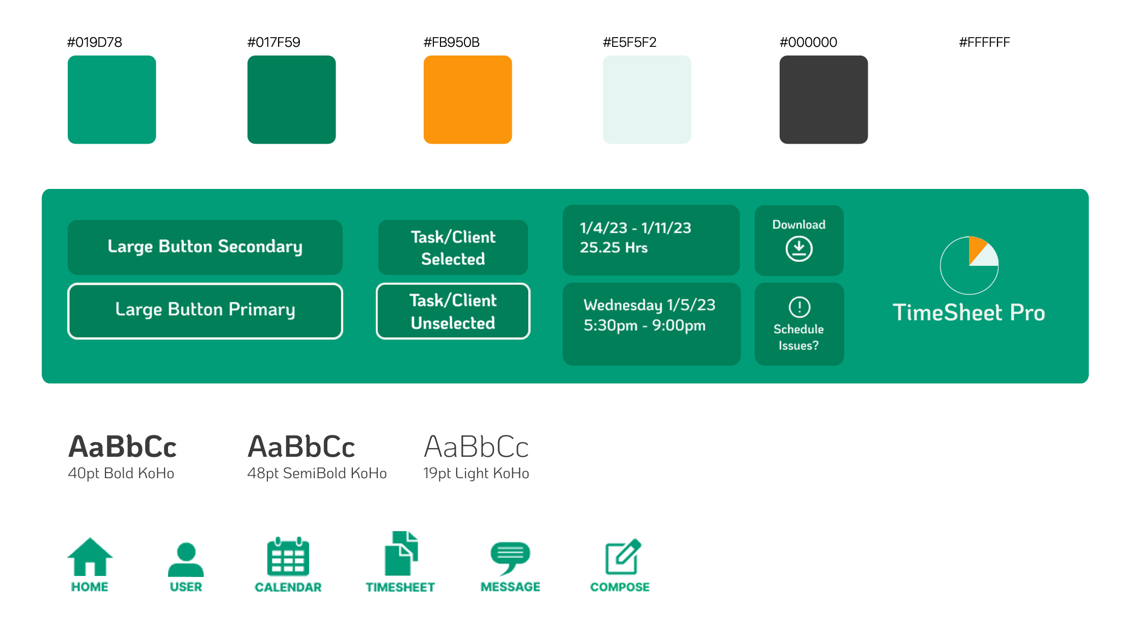 Efforts were made to keep button sizes and text consistent throughout the system. The palette used green as the primary color because the app is focused on tracking time for paychecks (similar to many banking palettes).