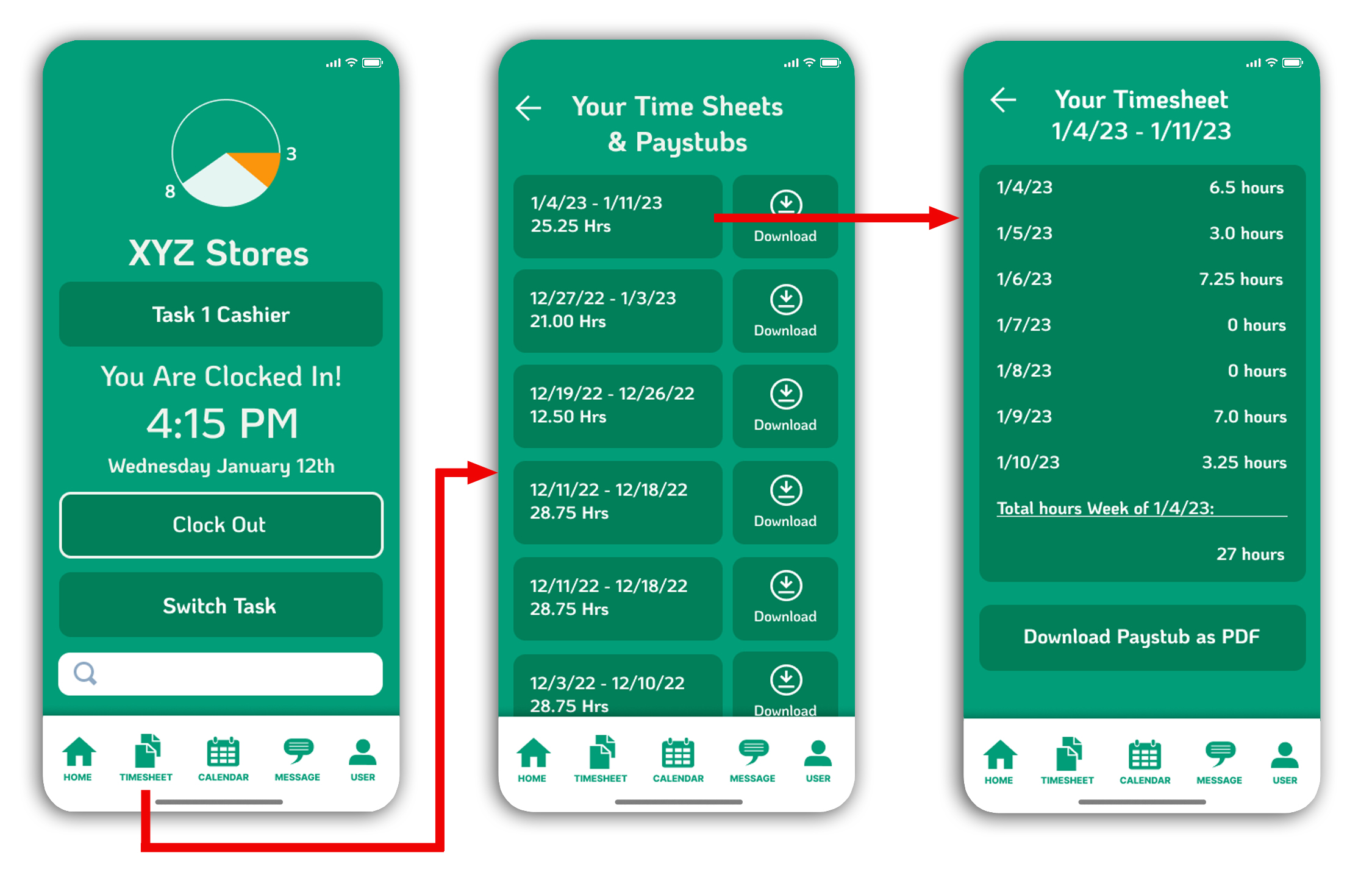 Users can access past timesheets within the app. Users can also download official paystubs as pdfs to their phone