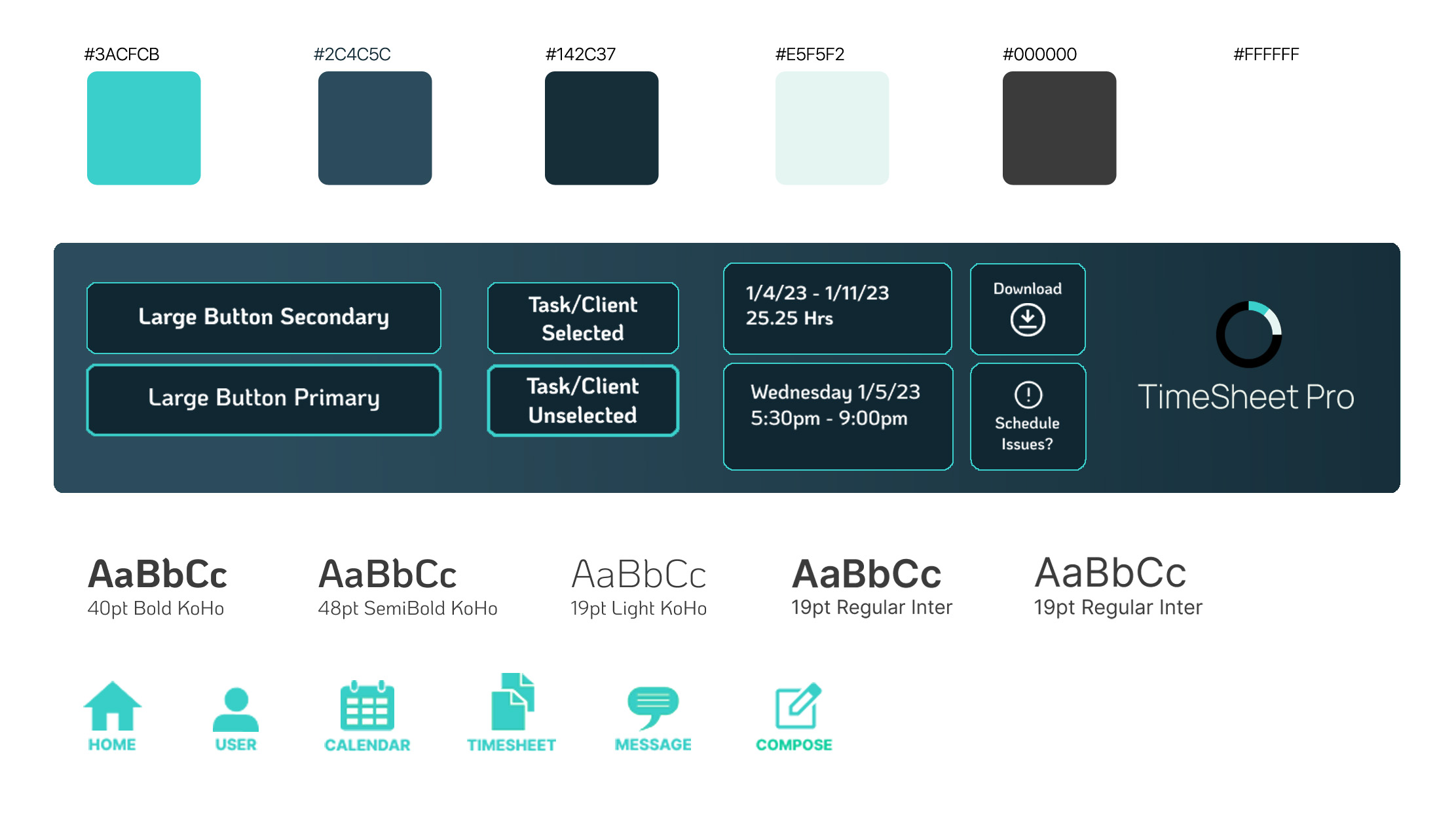 Efforts were made to keep button sizes and text consistent throughout the system. The palette used green as the primary color because the app is focused on tracking time for paychecks (similar to many banking palettes).