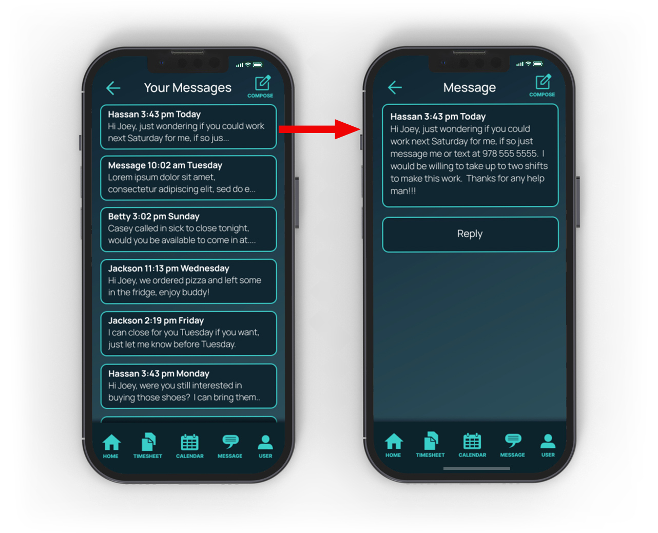 In app messaginge allows users to communicate with co-workers and managers. This feature facilitates user privacy as no phone numbers or emails are shared between users.