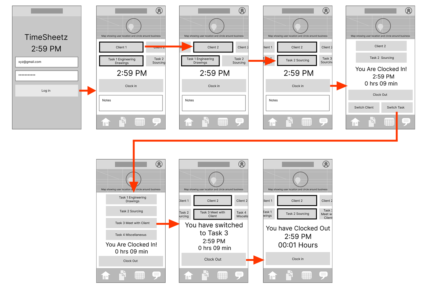 The main difference between freelancers and standard employees in the app is the ability to change clients. The user flow below shows the freelancer choosing from different clients and tasks.