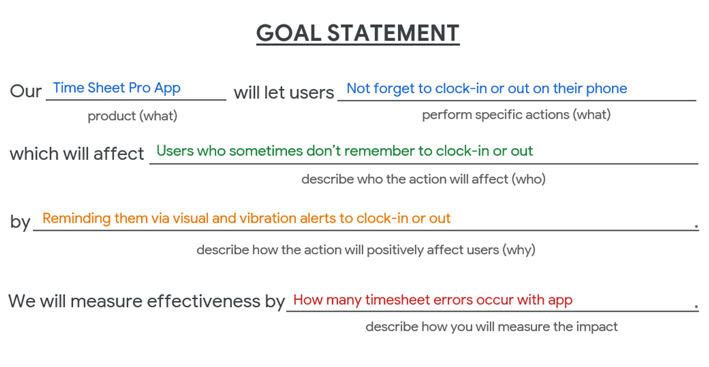 Prior to ideating on solutions with storyboards and wireframes we were asked to define the objective with a goal statement to help focus our approach