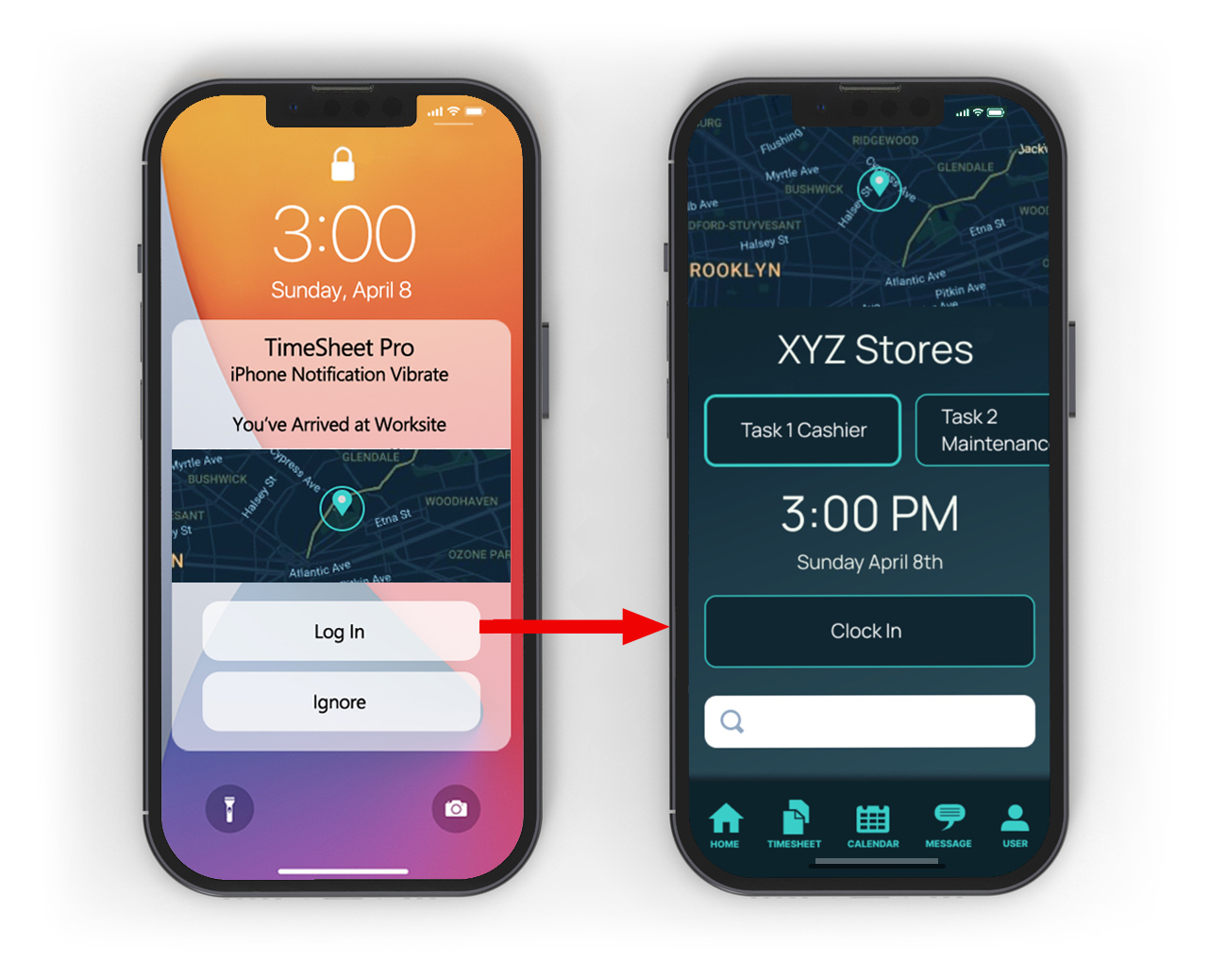 When a user's scheduled shift begins TimeSheet Pro notifies the user to clock in while giving an option to ignore the notification.