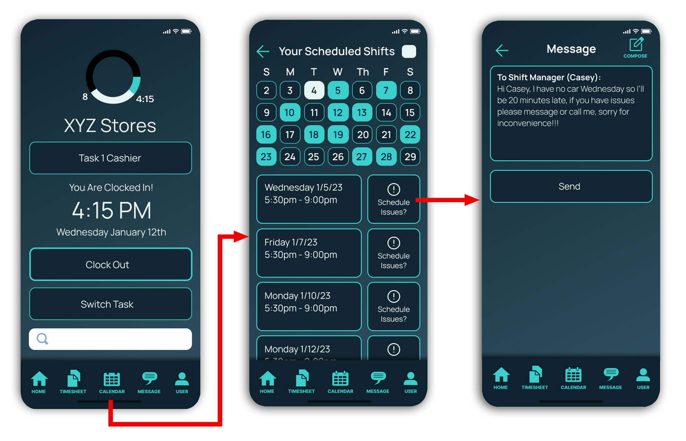 The calendar feature shows scheduled shifts for users and allows users to communicate with the manager in case of any issues with scheduling