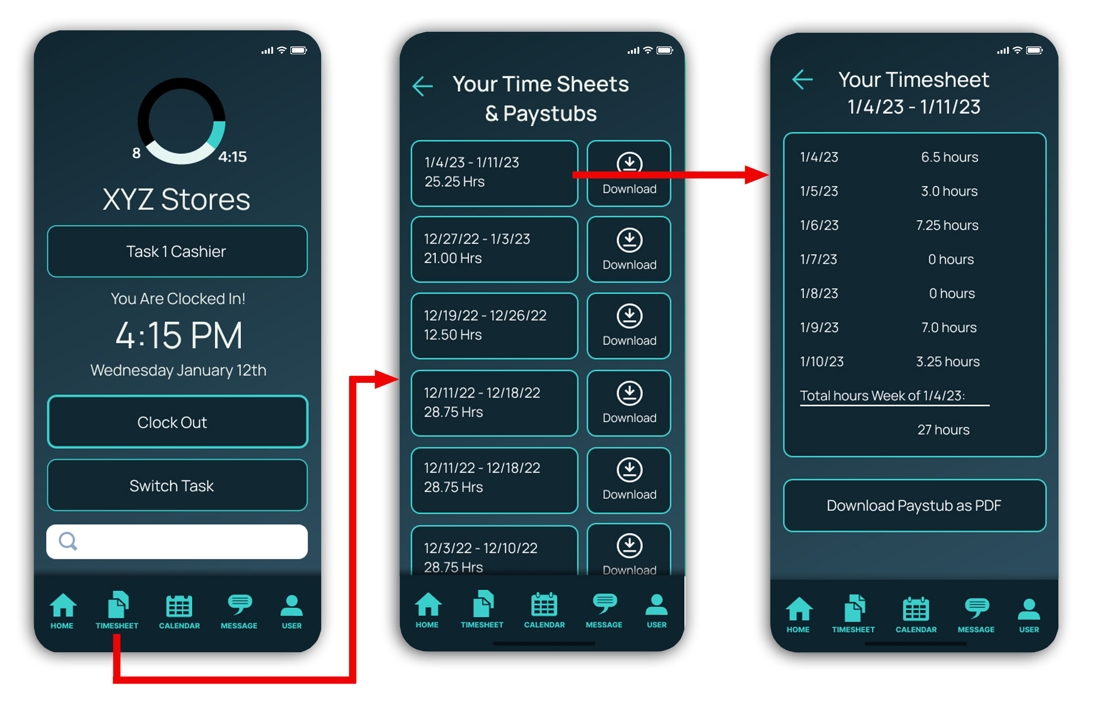 Users can access past timesheets within the app. Users can also download official paystubs as pdfs to their phone