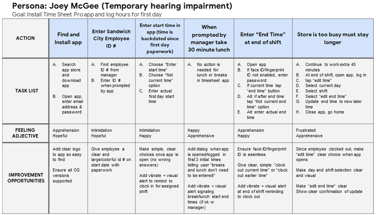 This User Journey was done for Joey to step through his first day at work with this new app. A temporary hearing impairment was added to Joey's persona to simulate the scenario for our user journey.